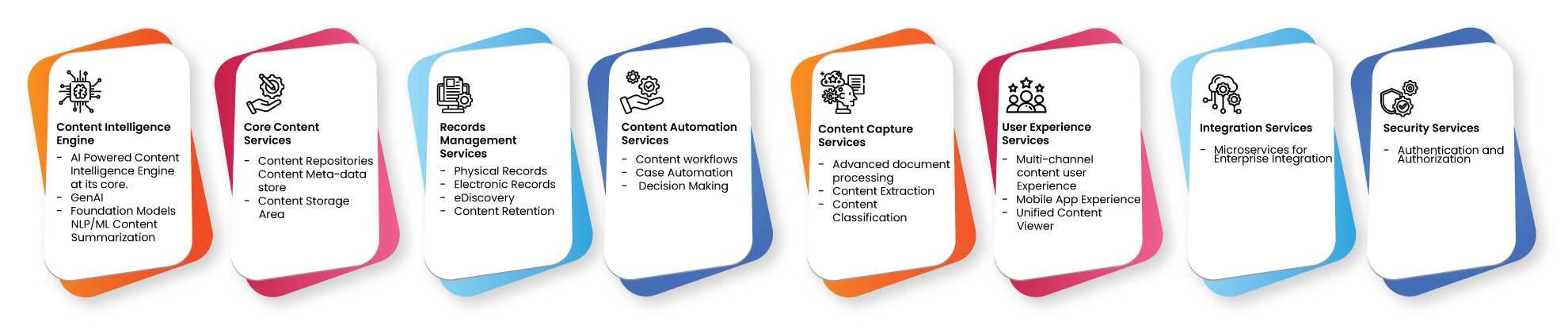 A modernized content services platform should be implemented with AI engine as its core platform. All of its services should be able to integrate with this AI engine. A reference architecture of a modernized content services platform is shown here: